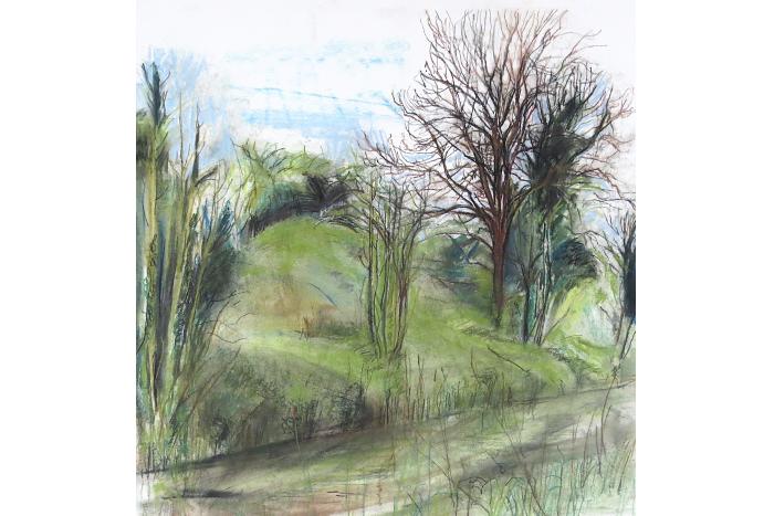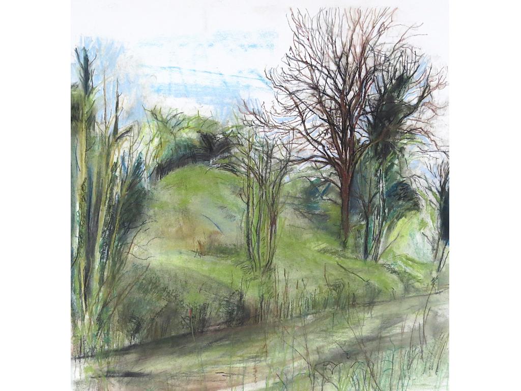 Conte drawing on watercolour paper. A series of 'Plein Air' drawings made alongside the Royal Canal from the end of 2024 and continuing into 2025/26. The drawings explore an area best described as a 'no mans land' between the canal and the train tracks that run parallel. The section of land has allowed nature to flouish without human inference.