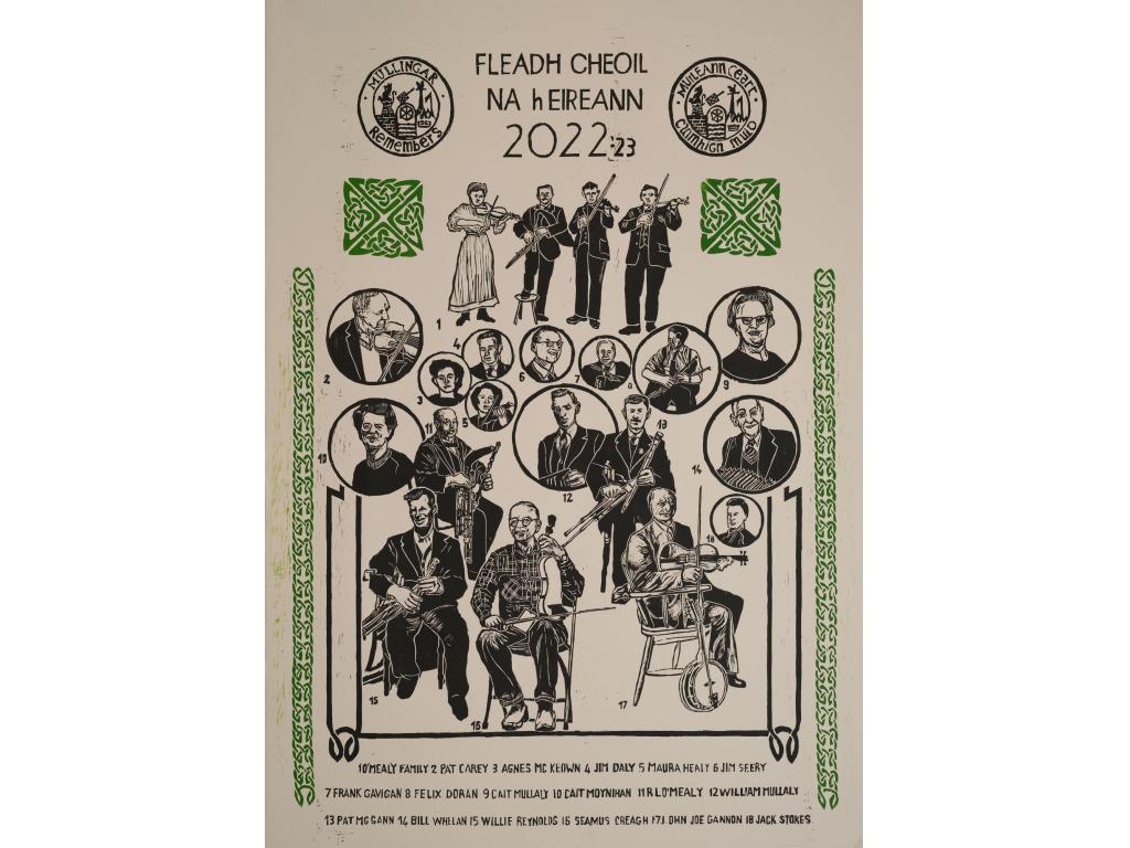 A Creative Ireland commission from Westmeath Arts Office celebrating the 2022 return of Fleadh Cheoil na hEireann to Mullingar, Co. Westmeath where it first originated. O’Reilly created a large woodblock poster featuring traditional musicians from the wider Mullingar area who kept the tradition alive when the music wasn’t popular or profitable. It now hangs in the Comhaltas Regional Headquarters, Aras an Mhuilinn, Mullingar, Co. Westmeath