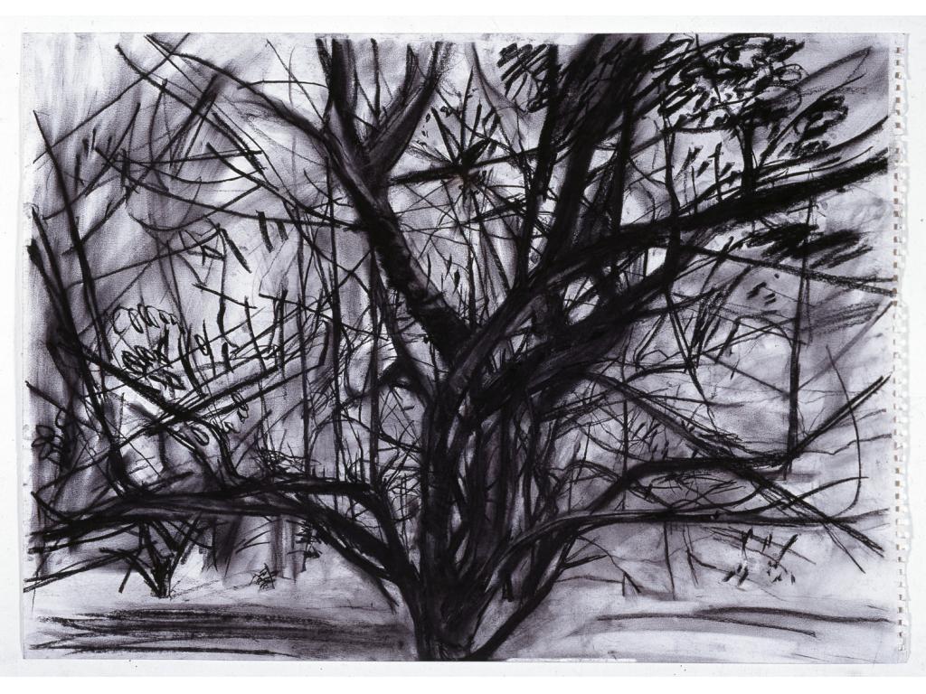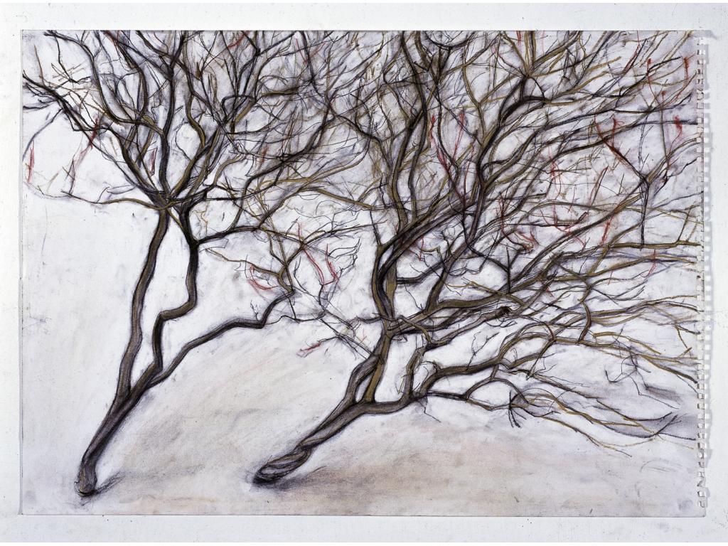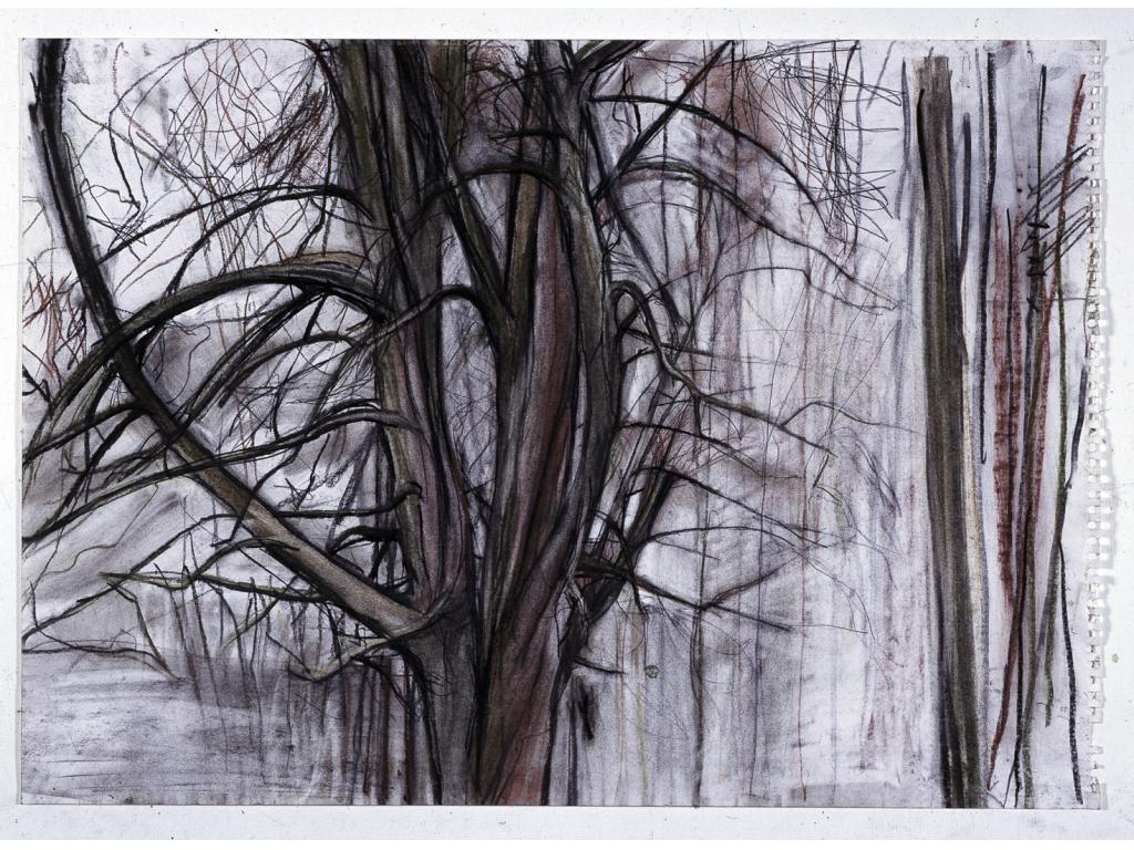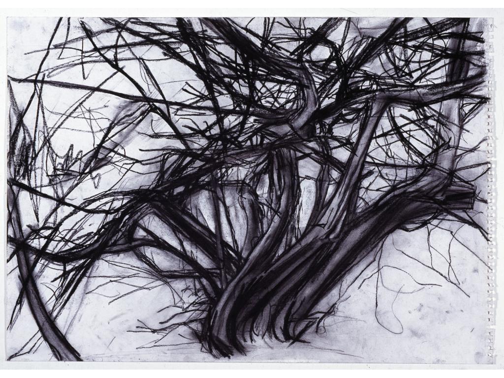 A series of A3 conte drawings created over a winter working in the outdoors at the Tyrone Guthrie Centre, Annaghmakerrig, Co Monaghan.