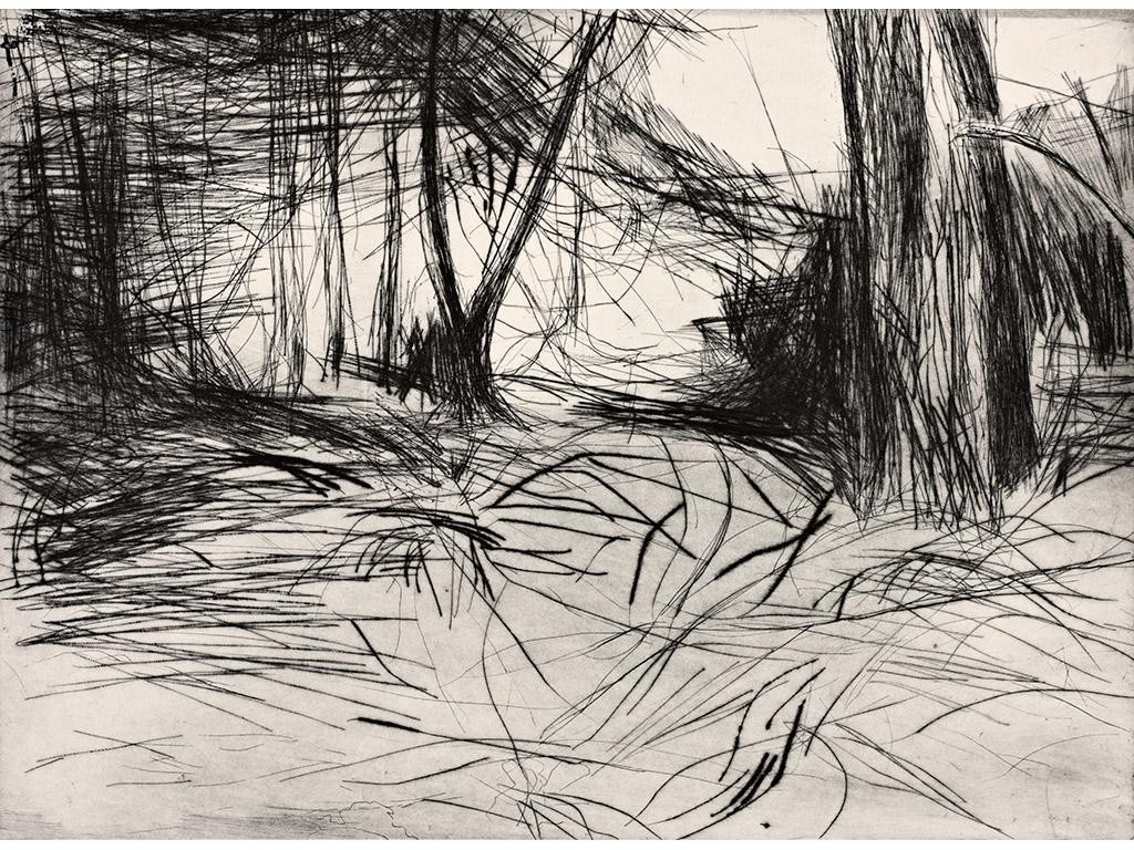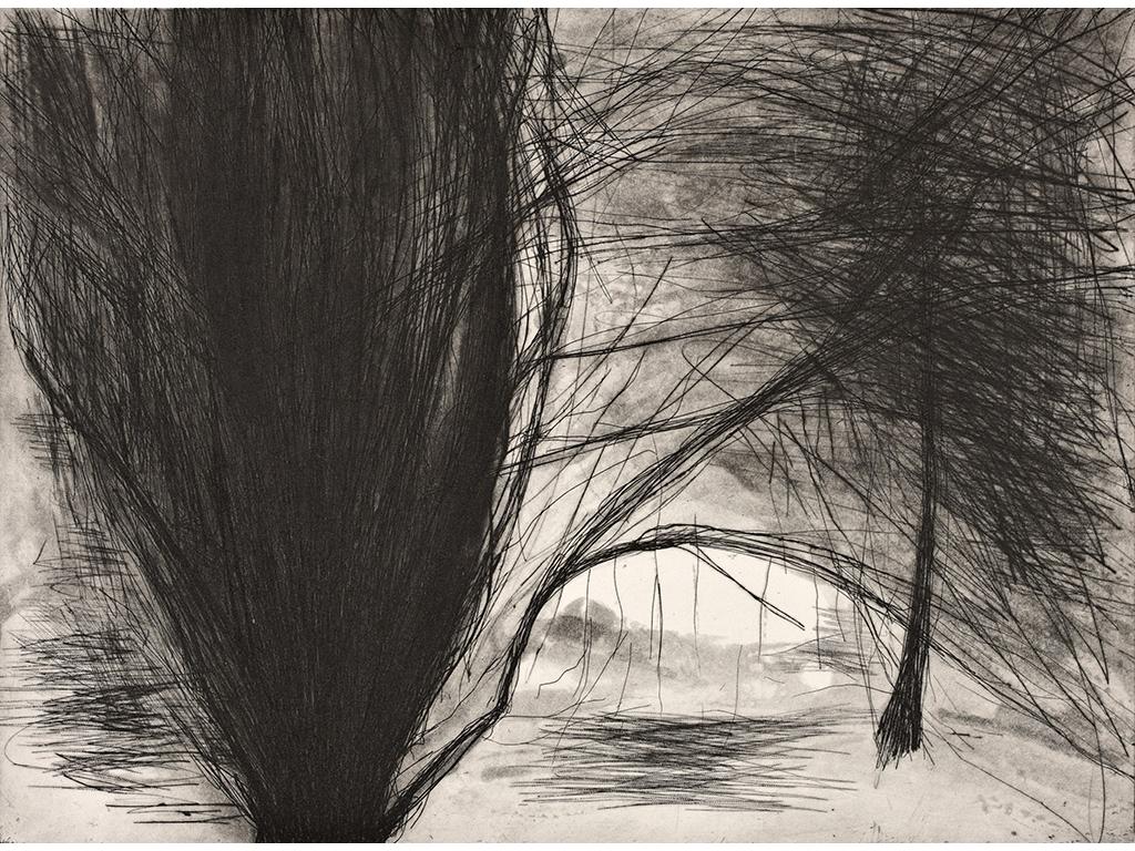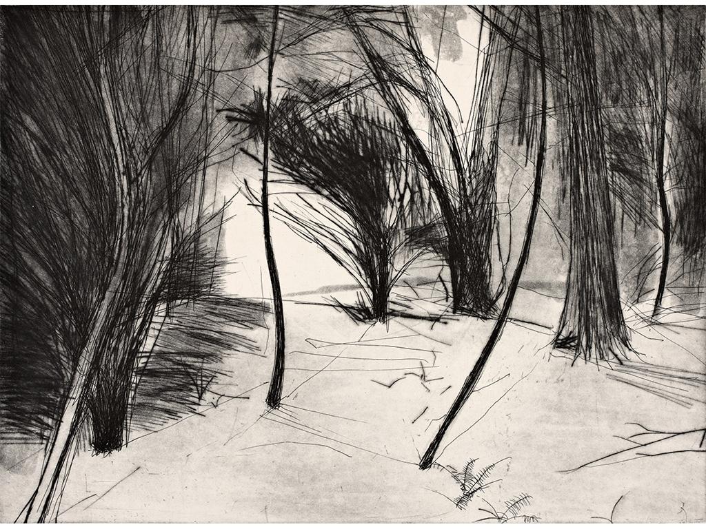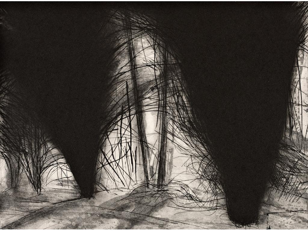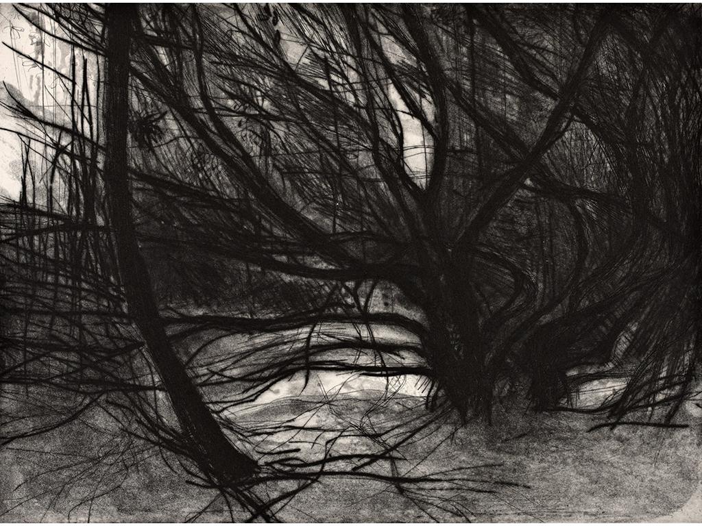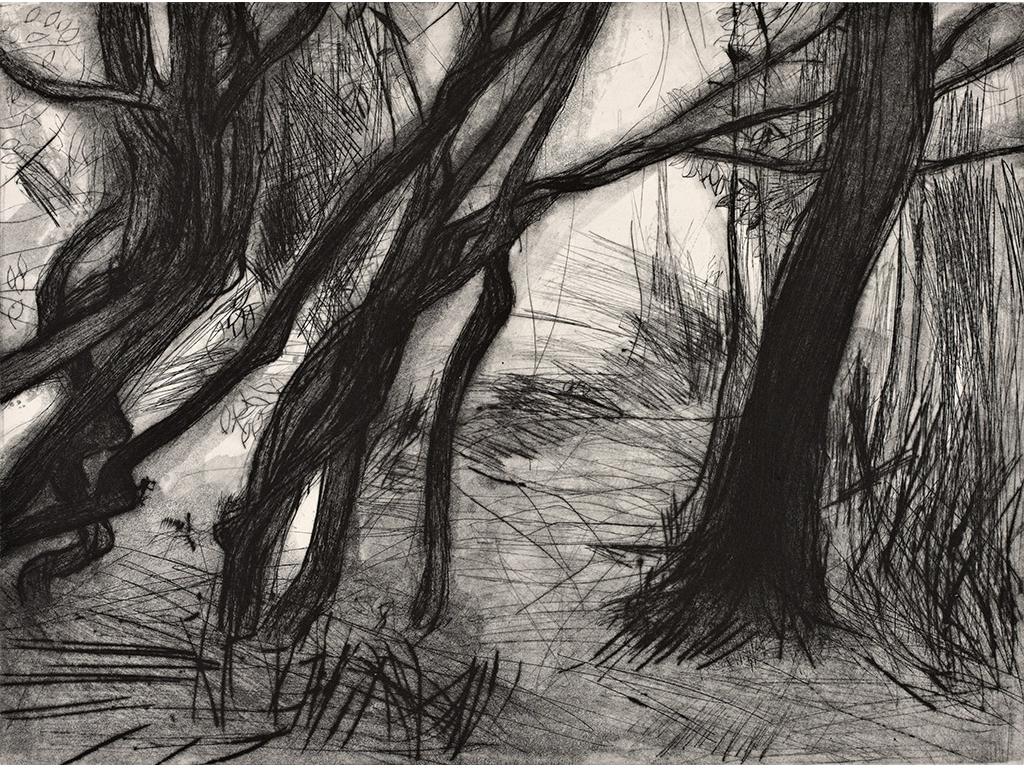 All the prints in this series of etchings feature forest or yew tree imagery. ‘Under the 17th century Yew walk in the woods on the Castle Leslie Estate, Glaslough, Co Monaghan. I was mesmerised by the tree’s ancient tendrils, sweeping upwards, as if they were bound in bundles. Something stirred in the unconscious’. The prints developed into a ‘shadow’ series. ‘Shadow’ is the term Carl Jung gave to the primitive and instinctive side of the individual.
